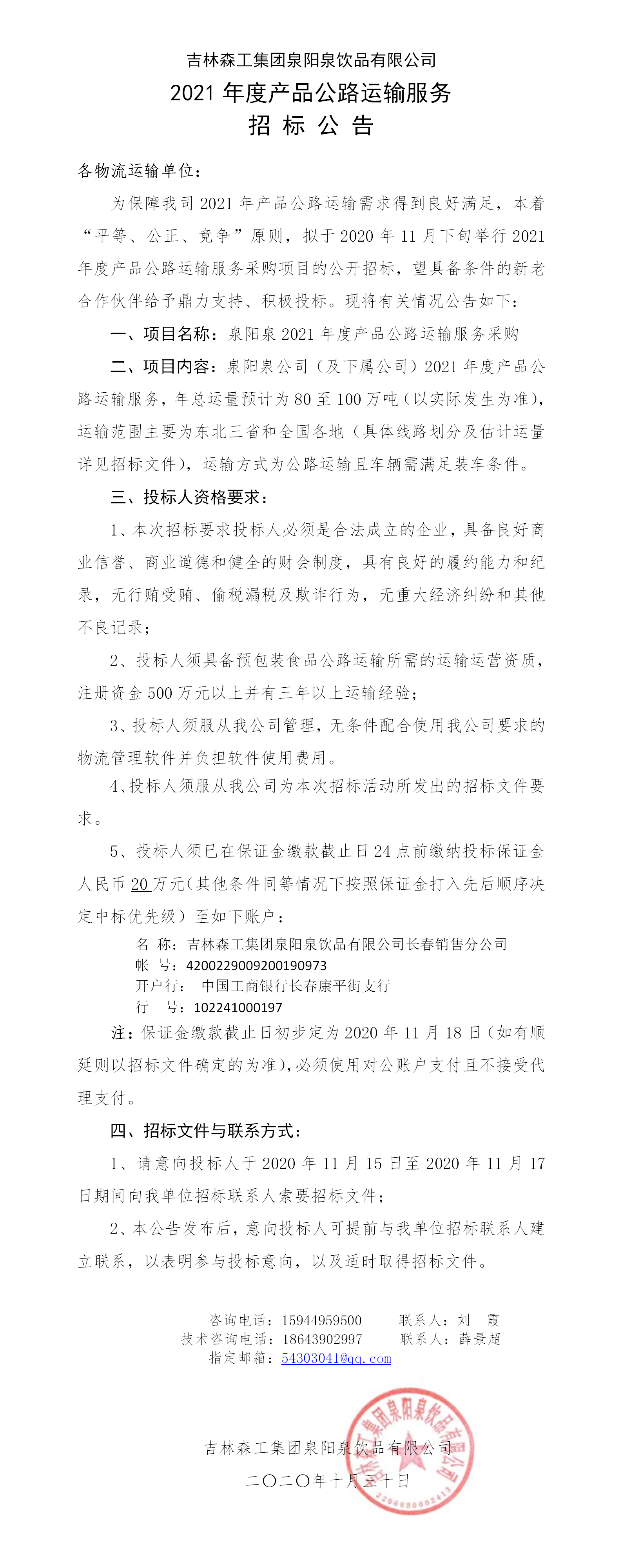 2021年度產(chǎn)品公路運輸服務(wù)招標公告